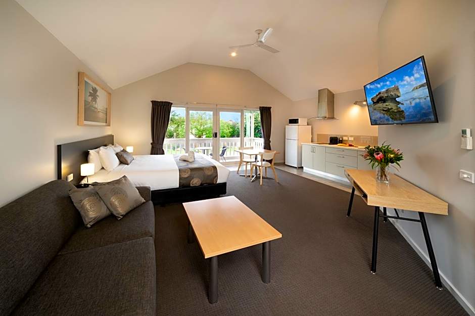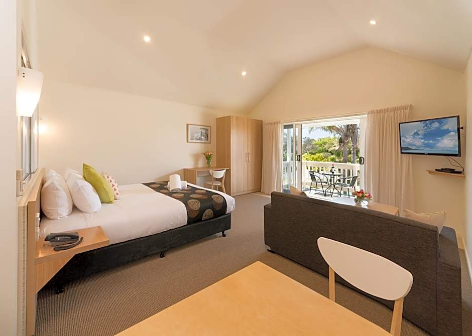 This spacious studio located upstairs includes a private balcony with outdoor setting. There is a king sized-bed with an electric blanket. The split-system air-conditioned suite includes an open-plan living and dining area, as well as a kitchenette with electric stovetop, toaster, kettle, microwave and refrigerator, and tea/ coffee making facilities The private bathroom includes a walk-in shower, spa bath, vanity, hairdryer and toiletries. The open-plan living area includes a TV and DVD player. Ironing facilities are available